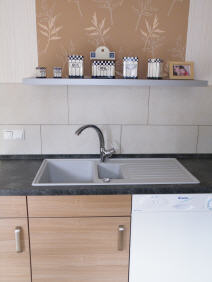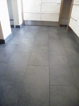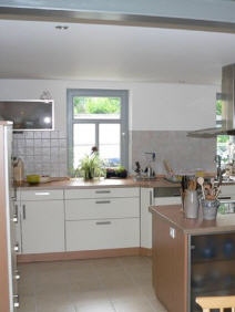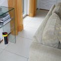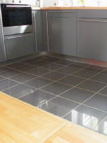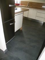 Beschreibung: Diese großformatige Fliesen in Küche und angrenzendem Flur geben den Räumen Weite. Eine attraktive Alternative sind die hochglänzenden Fliesen im Küchenbereich im Bild rechts unten.