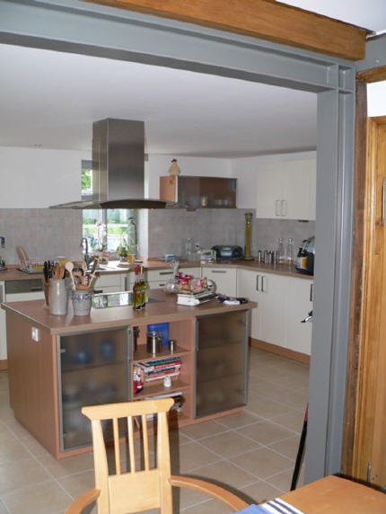 Beschreibung: Diese großformatige Fliesen in Küche und angrenzendem Flur geben den Räumen Weite. Eine attraktive Alternative sind die hochglänzenden Fliesen im Küchenbereich im Bild rechts unten.