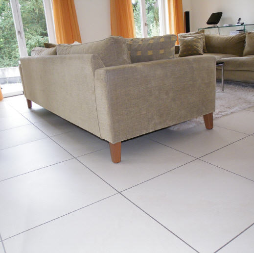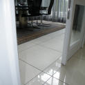 Beschreibung: Diese großformatigen Bodenfliesen mit hochglänzendem Randfries an Wänden und Türübergängen verleihen den Räumen Großzigikeit und Eleganz.
