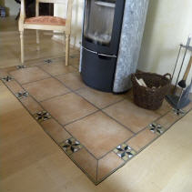 Beschreibung: Der feuerfeste, an den Dielenboden angearbeitete Fliesenbereich setzt den Kaminofen besonders gut in Szene.